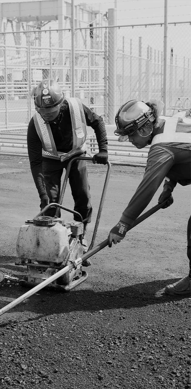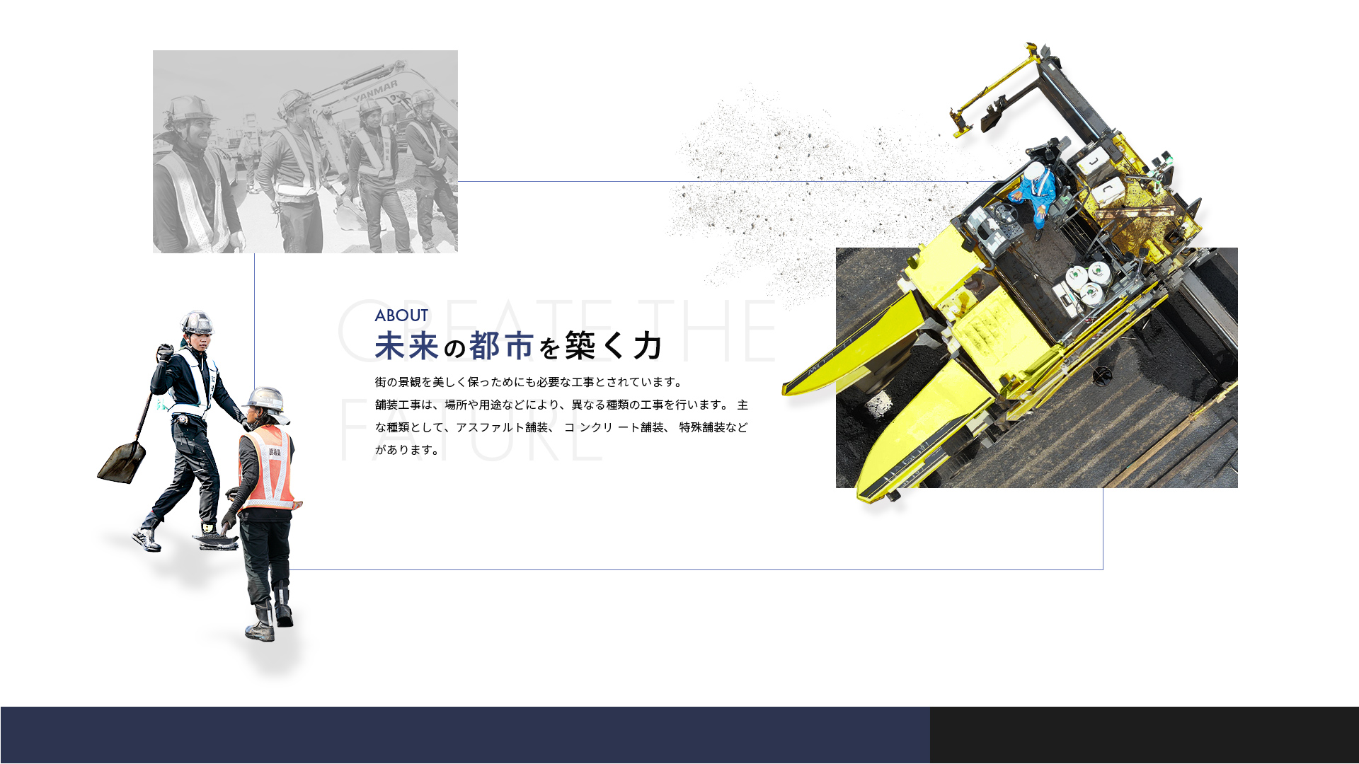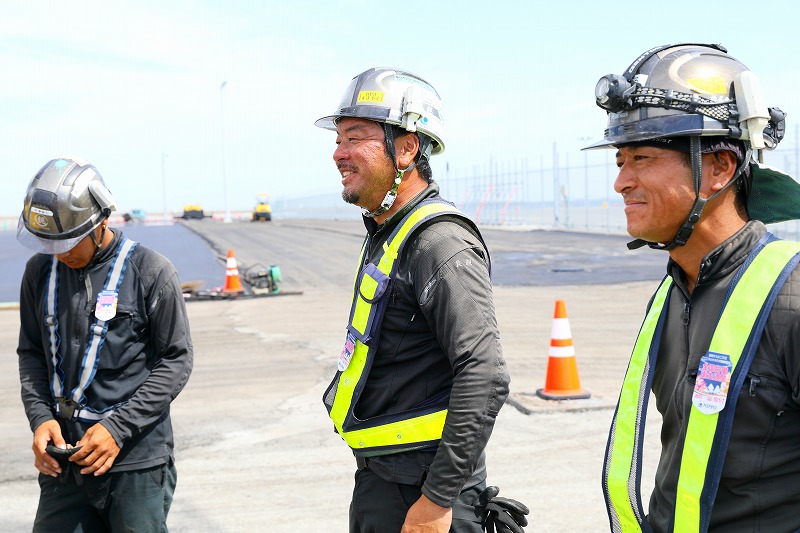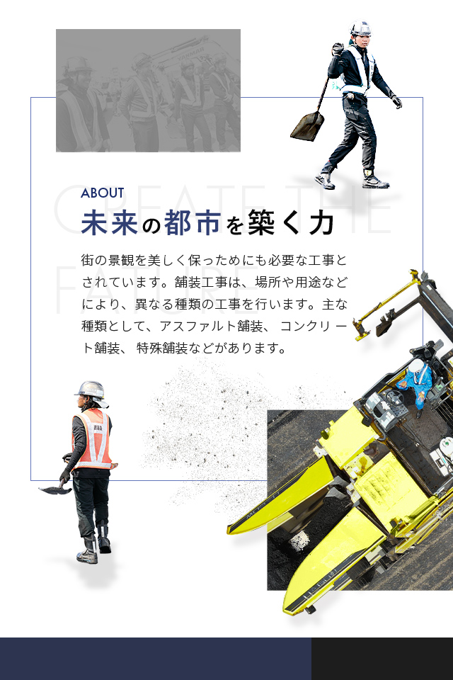 道路や駐車場をアスファルト等で舗装する仕事です。8~9人で1チームとなって、重機等を使用しながら舗装工事を行い、作業内容は、工事車両の運転(建設機械・資材運搬)や、スコップ・レーキでのアスファルトの敷き均し、ローラー・フィニッシャー(アジャスター)による締め固め等があります。